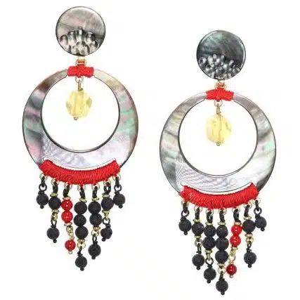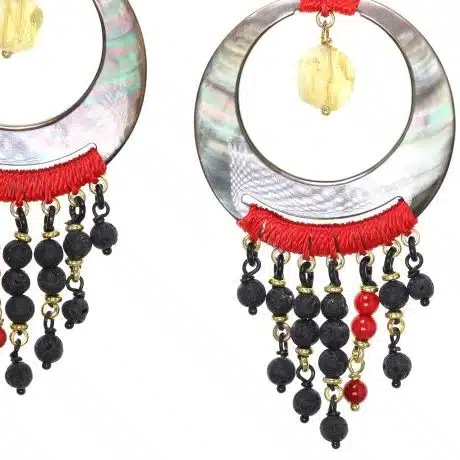Boucles d’oreilles en nacre grise, pierre de lave, quartz citrine, corail Keratoisis H 90 mm. Ø 40 mm