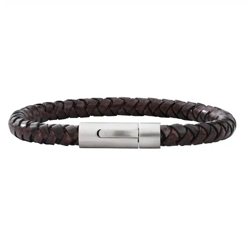Bracelet homme cuir tressé rond chocolat taille M standard. Écrin offert, certificat d’authenticité.