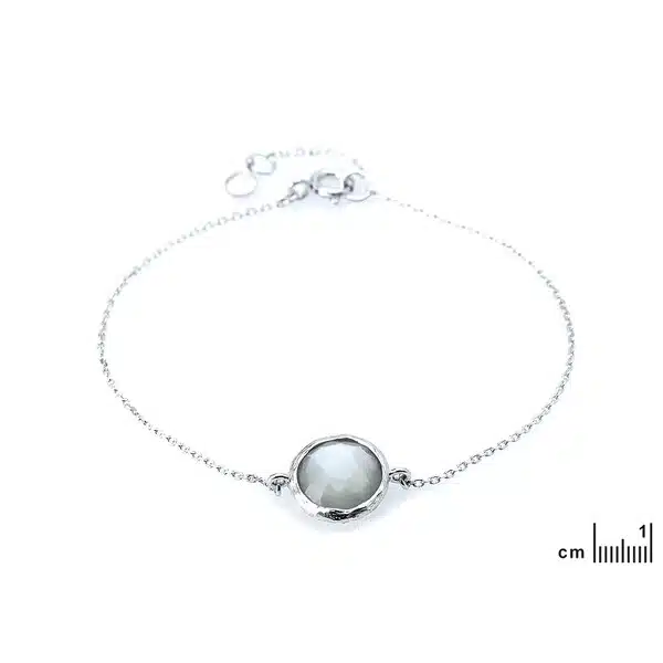 Bracelet composé d’une pierre de lune grise facettée Ø 10 mm. Chaîne argent rhodié L 16,5 cm – 18, 5 cm