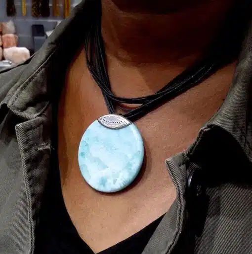 Collier en larimar composé d’un pendentif en larimar Ø 5 cm et d’un tour de cou multi cordons en coton ciré, longueur ajustable.