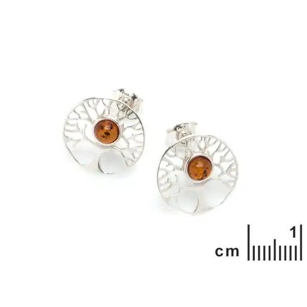 Boucles d’oreilles arbre de vie en ambre. Diamètre total : 15 mm