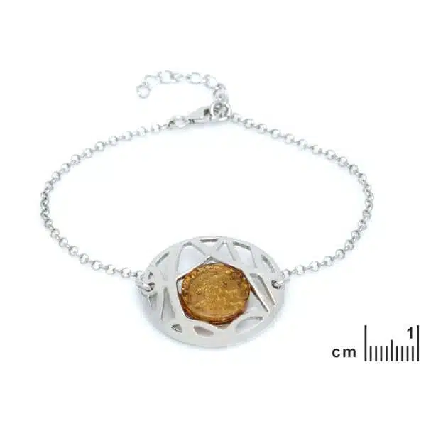 Bracelet en ambre, ajustable de 18 cm à 21 cm (pour toute taille de poignet). Motif central Ø 27 mm.