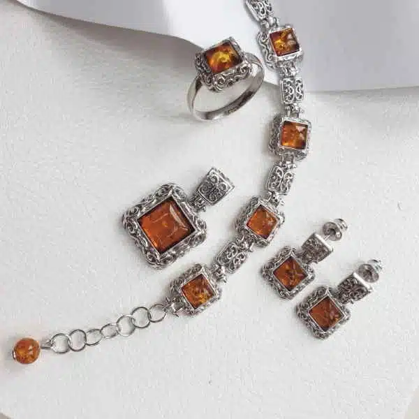 Ambre de la Baltique. L’appellation ARGENT 925/1000 indique la proportion d’argent fin dans le bijou au titrage légal.