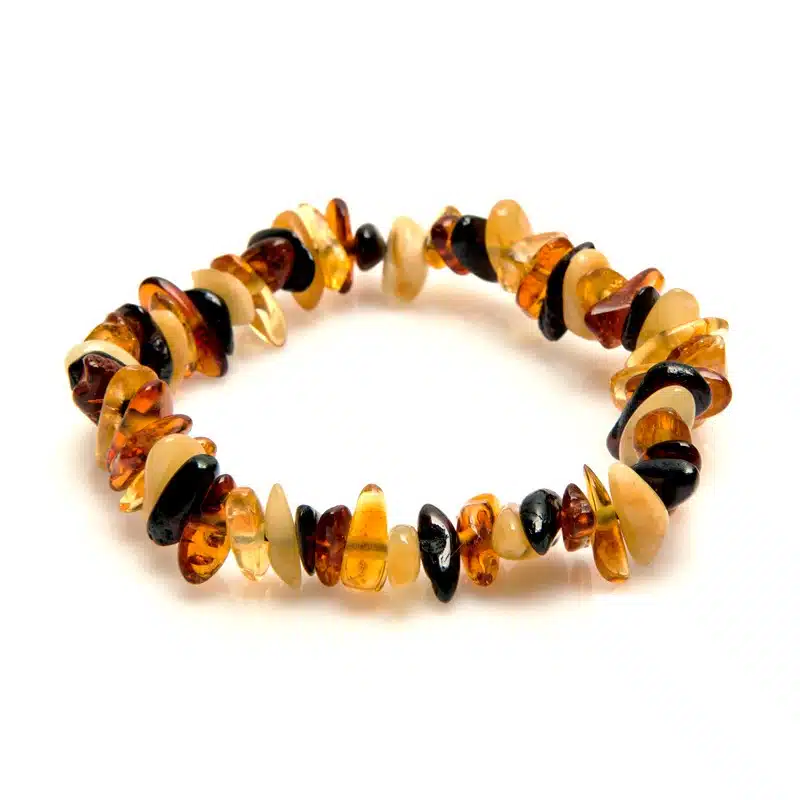 Bracelet en ambre multicolore, taille standard, enfilage élastique.