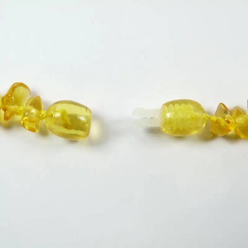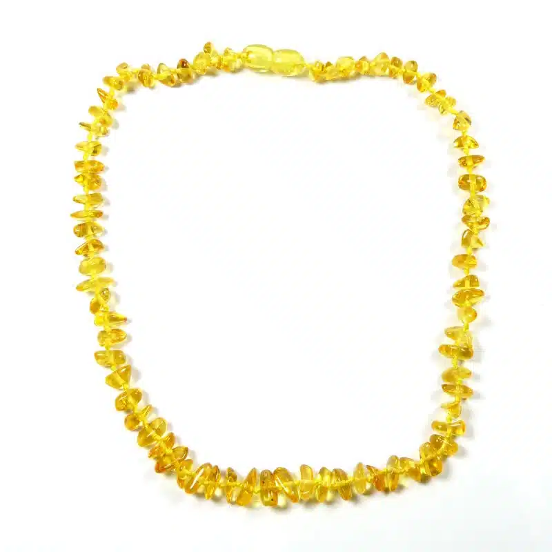 Collier en ambre baroque citron réalisé à partir de véritables perles d’ambre naturel de la mer Baltique, soigneusement polies pour un toucher doux et agréable.