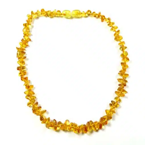 Collier en ambre baroque miel réalisé à partir de véritables perles d’ambre naturel de la mer Baltique, soigneusement polies pour un toucher doux et agréable.