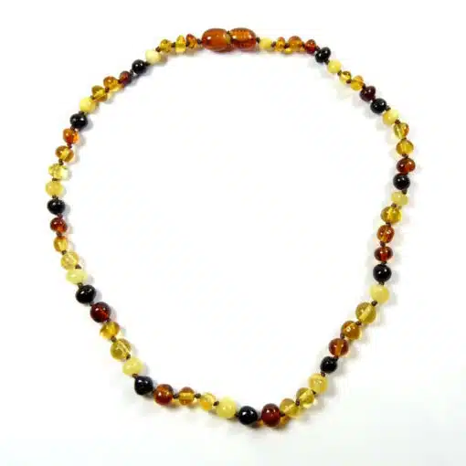 Collier en ambre multicolore réalisé à partir de véritables perles d’ambre naturel de la mer Baltique, soigneusement polies pour un toucher doux et agréable.