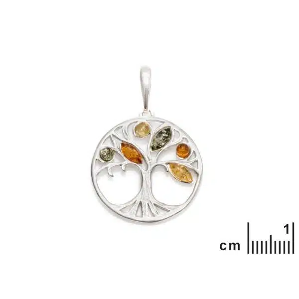 Pendentif arbre de vie en ambre. Hauteur totale du pendentif : 35 mm. Diamètre : 25 mm.