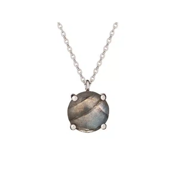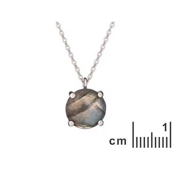 Collier composé d’un pendentif en labradorite facettée Ø 9 mm. Chaîne argent rhodié L. 42 – 45 cm, chaînette d’ajustement.