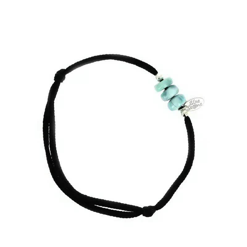 Bracelet en larimar sur cordon ajustable par coulisses, trois perles de larimar.