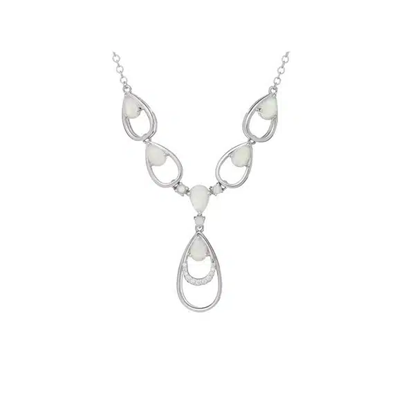 Collier en opale noble, opale blanche d’Australie et oxydes. L’appellation ARGENT 925/1000 indique la proportion d’argent fin dans le bijou au titrage légal. Le rhodium est un métal du groupe du platine. Une fine couche de rhodium sur l’argent confère au bijou un éclat similaire à celui de l’or blanc et le protège de l’oxydation pour un brillant durable.