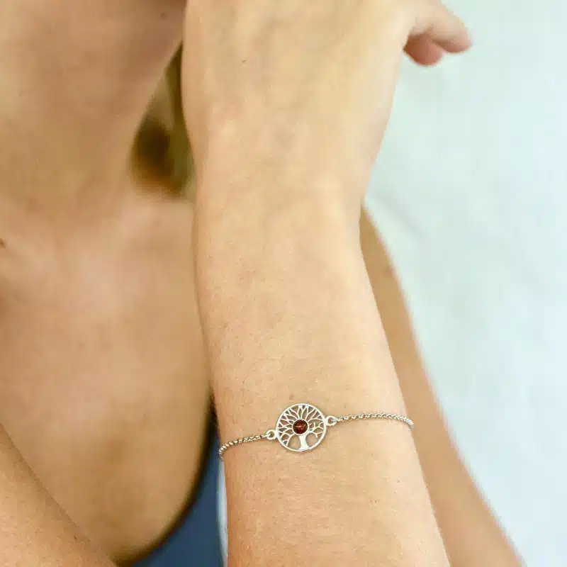 Bracelet arbre de vie en ambre et argent rhodié L. 15 – 18 cm (ajustable, chaînette d’ajustement)