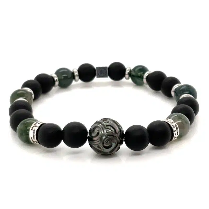 Bracelet pour homme en agate mousse, agate noire Ø 8 mm et perle de Tahiti gravée Ø 11-12 mm. Taille M standard.