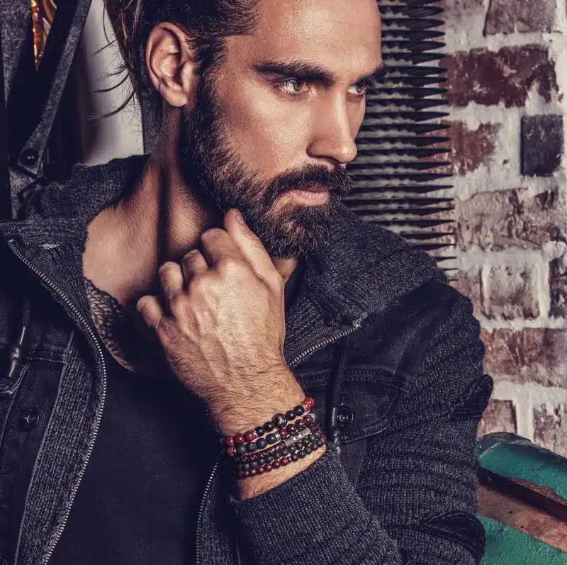 Bracelet pour homme en jaspe rouge, agate noire, pierre de lave et perle de Tahiti gravée.