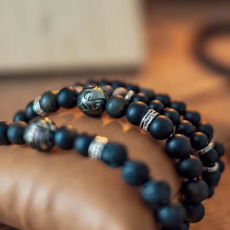 Bracelet pour homme en pierre de lave, obsidienne dorée Ø 8 mm et perle de Tahiti gravée Ø 11-12 mm. Taille M standard.