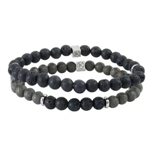 Bracelet pour homme en pyrite de fer dépolie aspect mat et pierre de lave Ø 6 mm, double rang. Taille L grande taille.