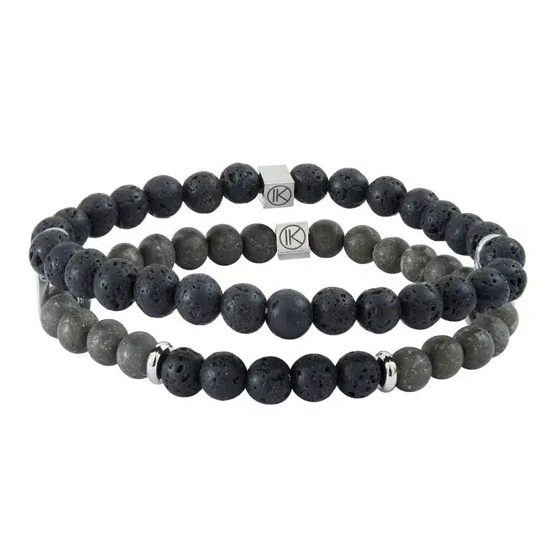 Bracelet pour homme en pyrite de fer dépolie aspect mat et pierre de lave Ø 6 mm, double rang. Taille M standard.