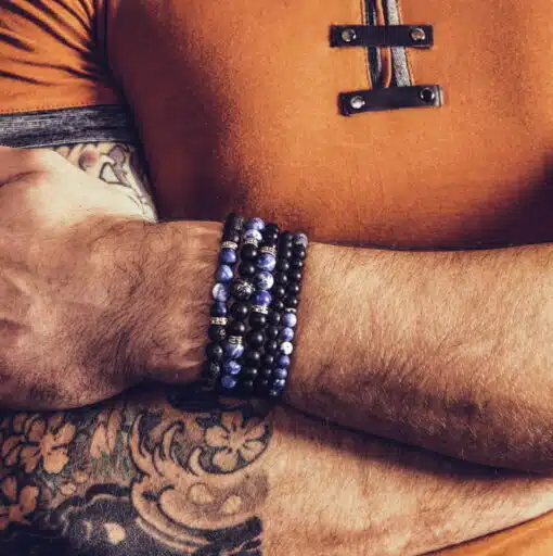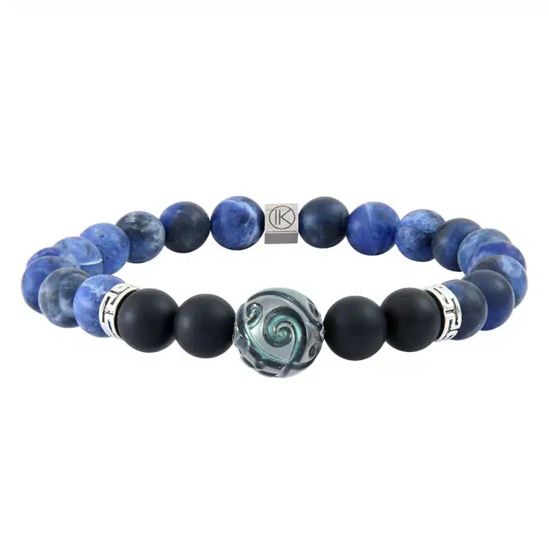 Bracelet pour homme en sodalite, agate noire et perle de Tahiti gravée.