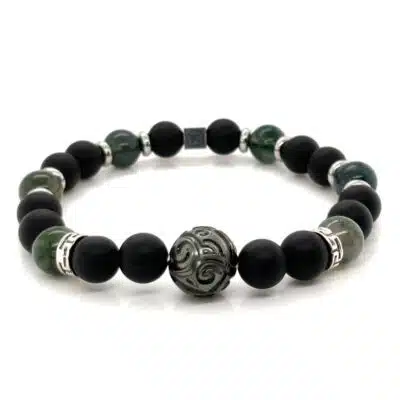 Bracelet homme agate mousse, perle de Tahiti gravée – L